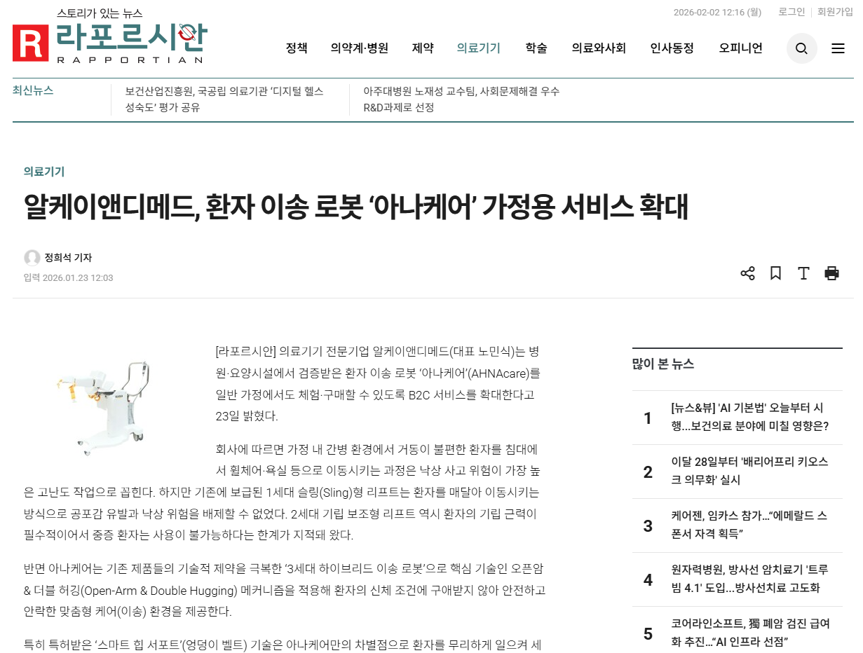 [기사] 라포르시안_알케이앤디메드, 환자 이송 로봇 ‘아나케어’ 가정용 서비스 확대