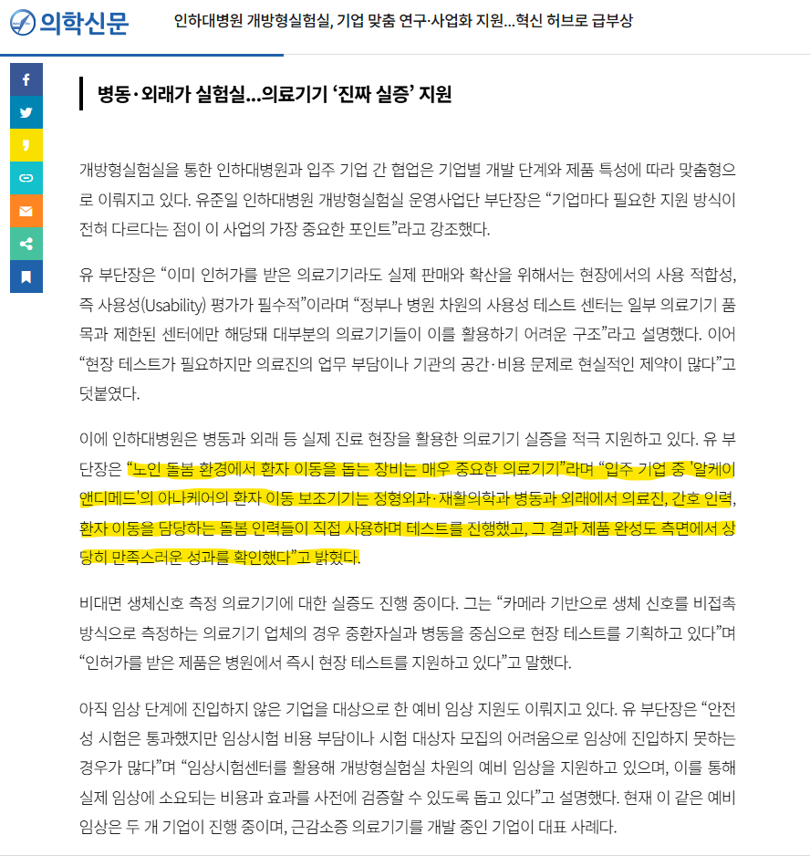 [기사] 의학신문_인하대병원 개방형실험실, 기업 맞춤 연구사업화 지원..."아나케어의 제품 완성도, 만족스런운 성과"